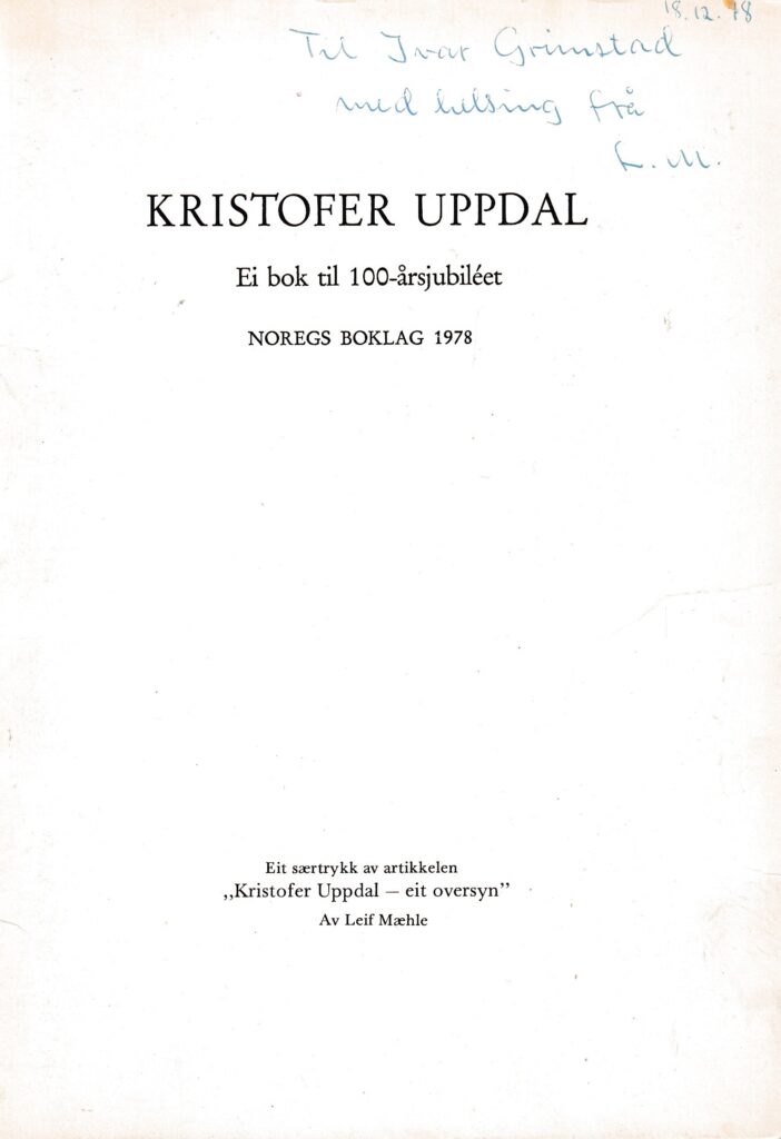 «Til Ivar Grimstad med helsing frå L.M. (Leif Mæhle)